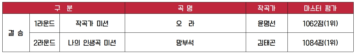 결승전의 작곡가 미션에는 윤명선 작곡가의 ‘오라’를 불렀습니다. 윤명선 작곡가는 장윤정의 ‘어머나’, 이승철의 ‘서쪽하늘’ 등을 작곡하였으며 예선전에서 홍가인 가수가 부른 송가인의 ‘엄마 아리랑’도 윤명선 작곡가의 작품입니다. 윤명선 작곡가는 실험적인 작곡을 많이 하며 트로트뿐만 아니라 다른 장르의 곡도 작곡을 하는 스펙트럼이 넓은 작곡가입니다. ‘오라’는 후렴구가 인상적인 곡으로 통통 튀는 듯한 리듬감이 홍지윤 가수에게 잘 어울리는 노래였습니다. 장윤정은 한 노래 안에 여러 가지 매력이 공존하는 곳인데 이 노래를 부를 수 있는 사람은 결승 진출자 중에는 홍지윤 가수뿐이라고 극찬하였습니다. 심사위원 점수 최고점 100점에 최저점 90점으로 전체 결승전 진출자 중에 1위를 하였습니다.