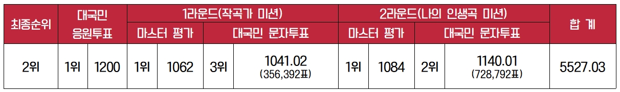 대국민 응원투표 부분과 심사위원 평가점수인 마스터 평가에서는 모두 1위를 하였지만 아쉽게도 대국민 문자투표 부분에서 각각 3위와 2위를 차지하며 2위의 성적으로 ‘미스트롯 2’를 마무리하였습니다. 예선전부터 가장 주목받는 가수들 중 한 명이었던 홍지윤 가수는 경연마다 레전드라고 할 수 있을 만큼의 무대들을 많이 남겼습니다. 개인적으로는 3차 본선 에이스 미션에서 보여주었던 ‘배띄워라’ 무대는 충격적이었습니다. 또한, 특유의 발랄함이 묻어나는 ‘꽃바람’, ‘오라’ 등의 무대도 많이 기억에 남는 무대입니다. 과거 성대 낭종과 다리 마비 등의 아픔을 딛고 일어나 포기하지 않고 계속 노래의 꿈을 이어온 홍지윤 가수가 앞으로 걷게 될 꽃길을 응원합니다.