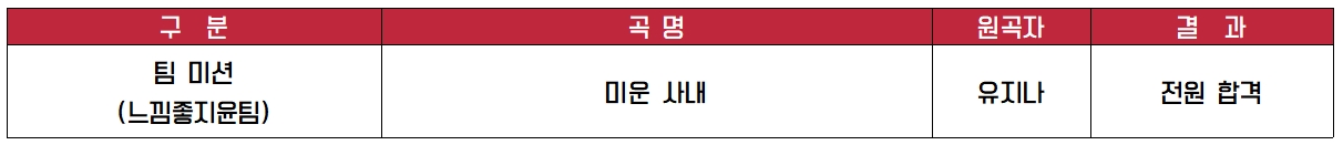 세미트로트를 할 것이라는 예상을 깨고 정통트로트 장르를 선택하였으며 유지나의 ‘미운 사내’를 선곡하였습니다. 팀에 소속된 홍지윤, 허찬미, 황우림, 김사은은 안정된 가창력을 바탕으로 유쾌한 무대를 꾸몄습니다. 장윤정은 아름다웠으며 과하지 않고 못하는 사람 없이 모두가 잘했다고 평가했습니다. 또한, 홍지윤 가수는 예선전 선이라는 것을 증명하듯 자기 소리를 내주어서 올 하트를 받을 자격이 충분했다고 평가했습니다. 박선주는 많은 오디션 프로그램이 있으나 본인이 꿈꾸고 보고 싶었던 멋진 그림의 팀이었다고 평가했습니다. 결과적으로 정통트로트 장르를 선택한 것은 좋은 선택이었으며 호평과 함께 심사위원 모두의 선택을 받으며 전원 합격으로 본선 1차를 마무리하였습니다..