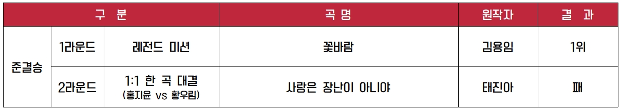 1대 1 한 곡 대결에서는 본선 1차에서 같은 팀을 한 적이 있는 황우림 가수와 1대 1 대결을 하였습니다. 선곡은 태진아의 ‘사랑은 장난이 아니야’를 하였습니다. 김준수는 용호상박이며 하나의 작품을 보는 느낌이었고 보면서 기분이 좋아지는 무대였다고 평하였습니다. 원곡자인 태진아는 두 가수 모두 엄청난 가수가 될 것이라고 평하였습니다. 심사위원 점수는 150대 150으로 동점을 기록하였으며 관객 점수 측면에서 황우림 가수에 비해 조금 낮은 점수를 받으며 패하였습니다. 해당 미션은 종합 9위의 순위를 기록하였으며 레전드 미션 결과와 합산하여 전체 4등으로 결승전 진출을 확정하였습니다.
