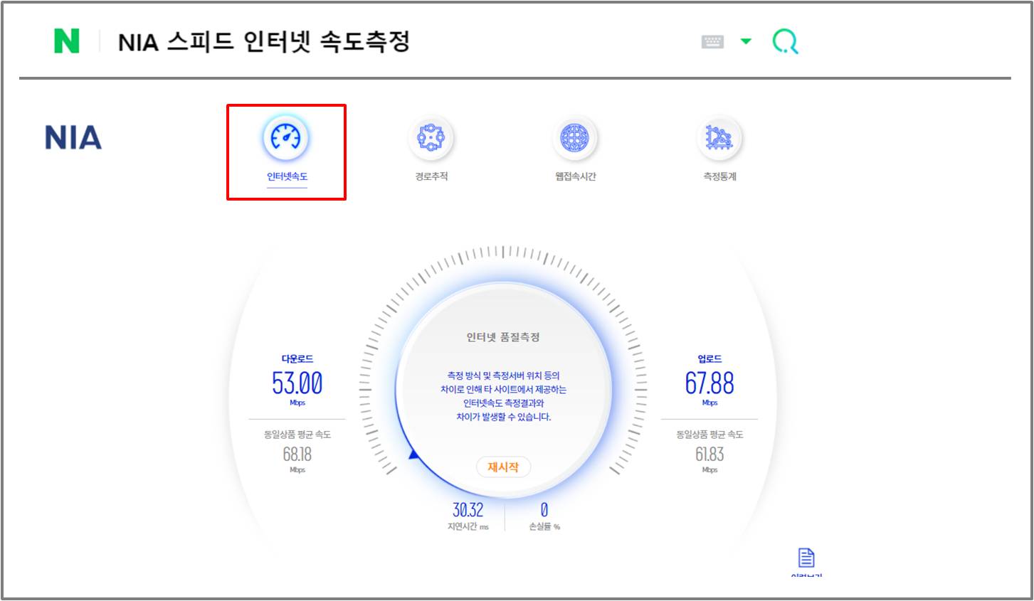 한국지능정보사회진흥원(NIA) : NIA스피드 인터넷 속도측정으로 검색하여 인터넷 속도측정 클릭