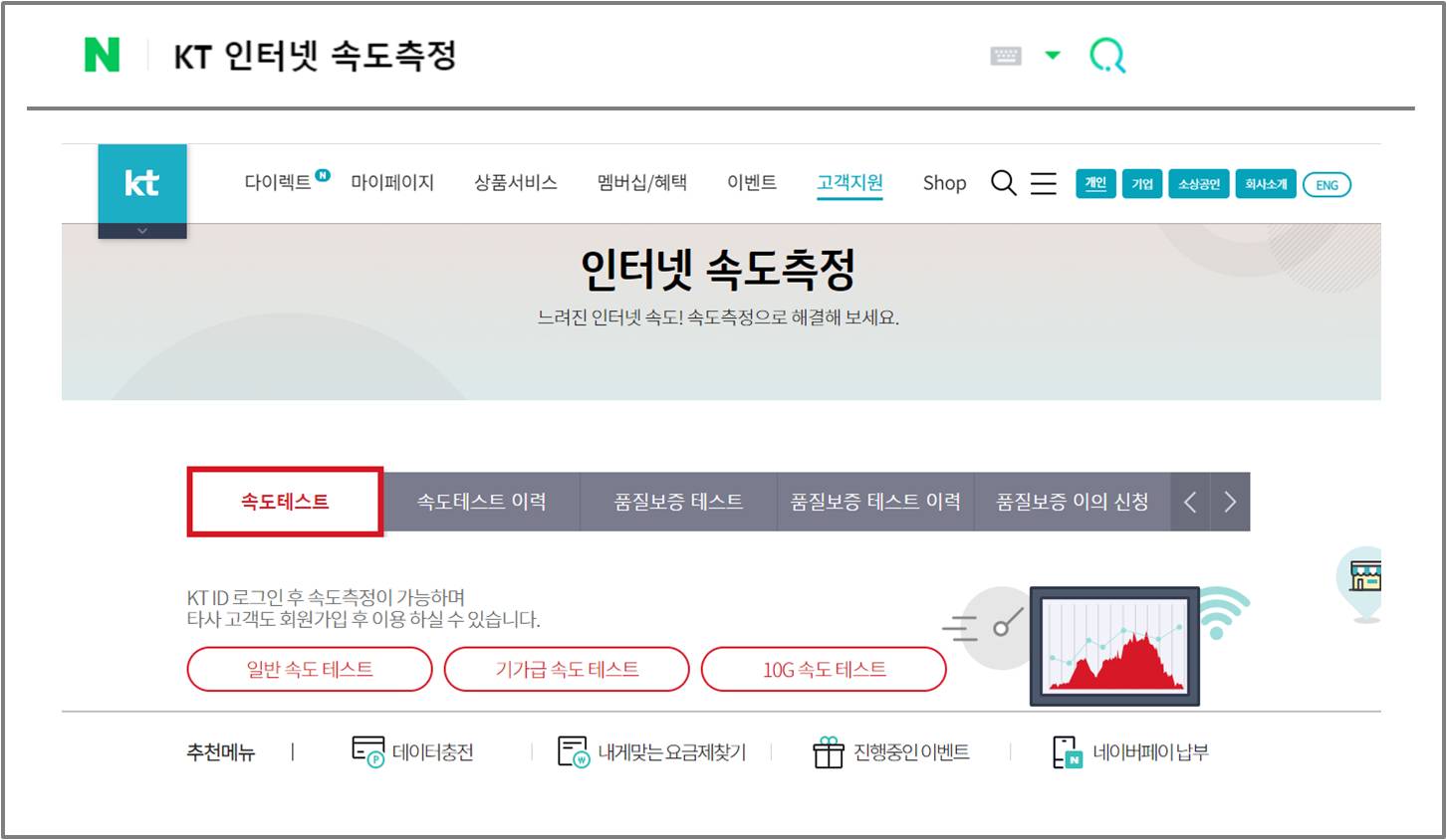 - KT 인터넷 : 검색창에 KT 인터넷 속도 측정으로 검색하거나 KT 홈페이지에서 고객지원란 클릭