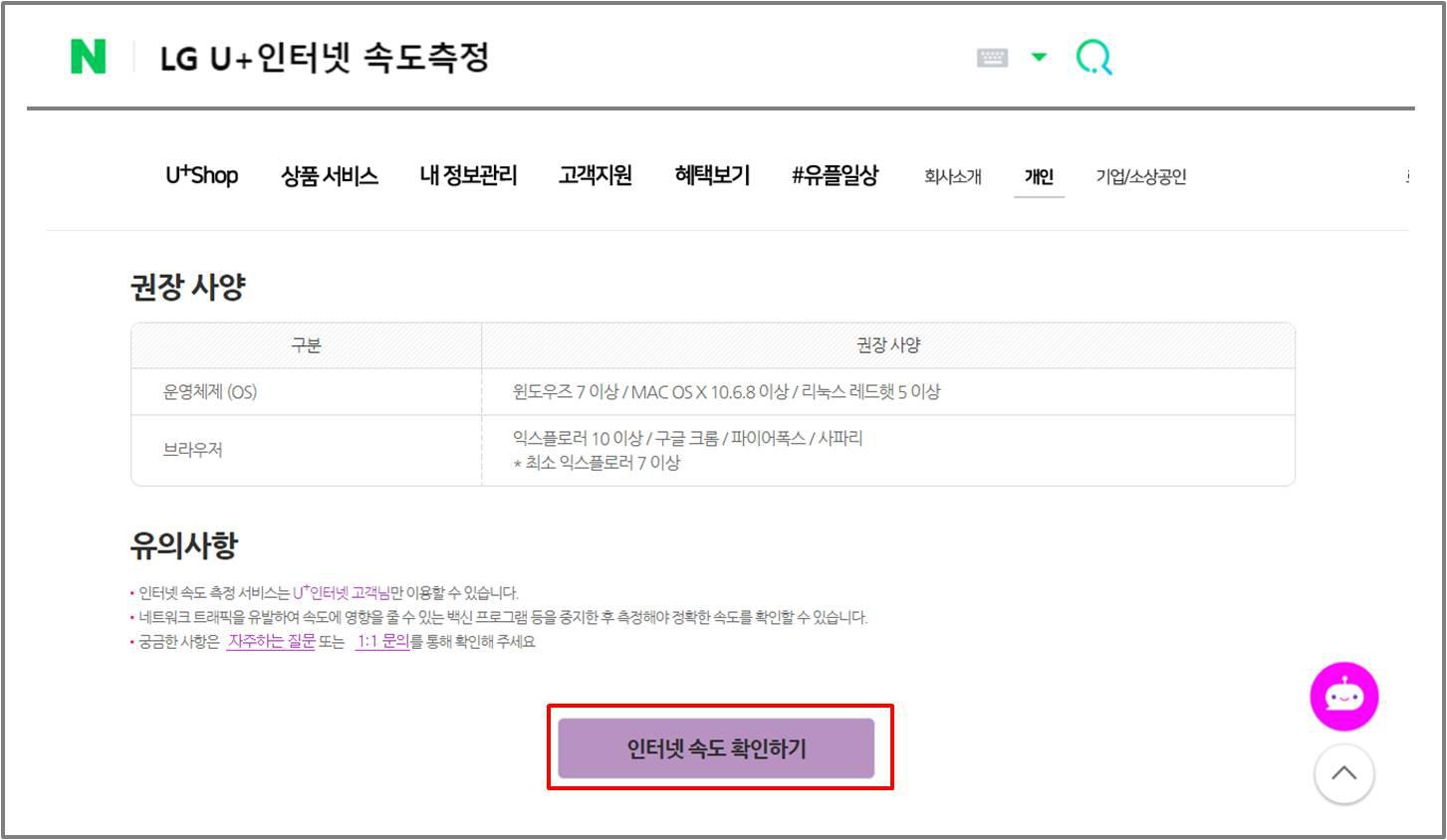 - LG U+ 인터넷 : LG U+인터넷 속도 측정으로 검색하거나 LG U+인터넷 홈페이지에서 고객지원란 클릭