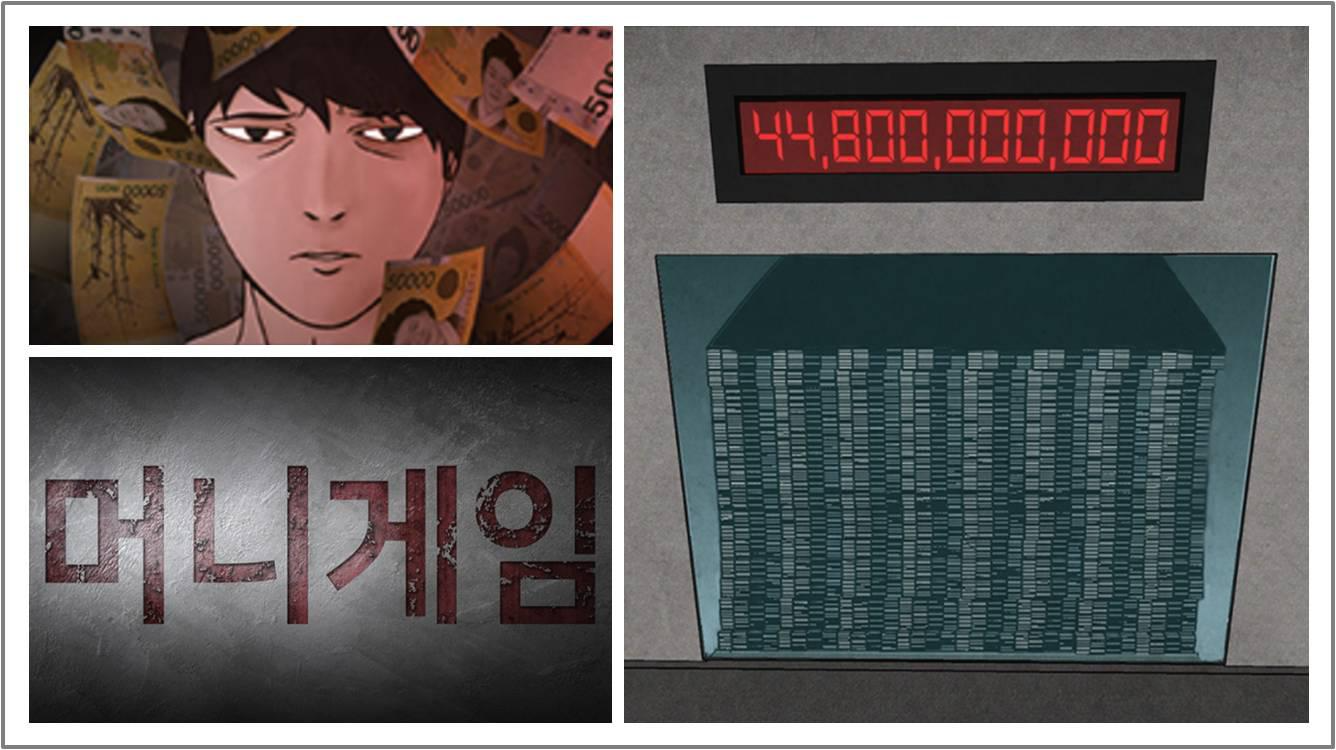 웹툰 머니게임에서는 100일 동안 8명의 참가자들이 통제된 공간에서 생활하며 벌어지는 이야기를 다루고 있습니다. 상금은 448억이며 8명의 참가자가 100일간의 기간을 생활 후 나갈 때 남은 돈을 인원수대로 균등하게 분배합니다. 해당 머니게임에는 몇 가지 규칙이 있습니다. 각자 8인은 프라이빗룸이 주어지며 자정(00시)부터 오전 8시까지는 각자의 프라이빗 룸에서 상주하여야 합니다. 각자의 방에는 인터폰이 있으며 인터폰을 통해서는 대부분의 물건이 구매 가능합니다. 누가 어떤 물건을 샀는지에 대한 정보는 공개되지 않으며 총, 도검과 같은 무기류의 구입은 불가능합니다. 총상금인 448억에서 구매한 물건의 금액들이 감액되며 잔액은 매일 아침에 갱신하여 잔액판에 표시됩니다. 해당 게임 안에서의 환율은 특별환율 1000배로 적용됩니다. 예를 들어 500원 짜리 생수의 경우 1000배의 가격인 5050만 원에 구입이 가능한 것입니다.