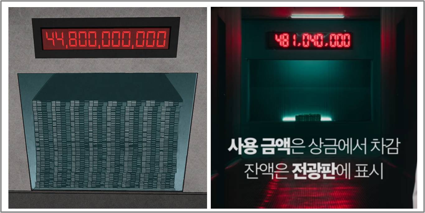 웹툰 머니게임에서는 100일 동안 8명의 참가자들이 통제된 공간에서 생활하며 벌어지는 이야기를 다루고 있습니다. 상금은 448억이며 8명의 참가자가 100일간의 기간을 생활 후 나갈 때 남은 돈을 인원수대로 균등하게 분배합니다. 해당 머니게임에는 몇 가지 규칙이 있습니다. 각자 8인은 프라이빗룸이 주어지며 자정(00시)부터 오전 8시까지는 각자의 프라이빗 룸에서 상주하여야 합니다. 각자의 방에는 인터폰이 있으며 인터폰을 통해서는 대부분의 물건이 구매 가능합니다. 누가 어떤 물건을 샀는지에 대한 정보는 공개되지 않으며 총, 도검과 같은 무기류의 구입은 불가능합니다. 총상금인 448억에서 구매한 물건의 금액들이 감액되며 잔액은 매일 아침에 갱신하여 잔액판에 표시됩니다. 해당 게임 안에서의 환율은 특별환율 1000배로 적용됩니다. 예를 들어 500원 짜리 생수의 경우 1000배의 가격인 5050만 원에 구입이 가능한 것입니다.
