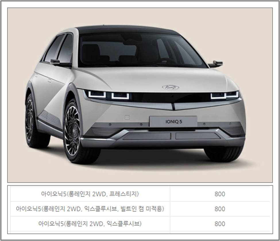 롱레인지 2WD, 프레스티지 / 롱레인지 2WD, 익스클루시브 / 롱레인지 2WD, 익스클루시브. 빌트인 캠 미적용 모두 800만원으로 동일합니다.