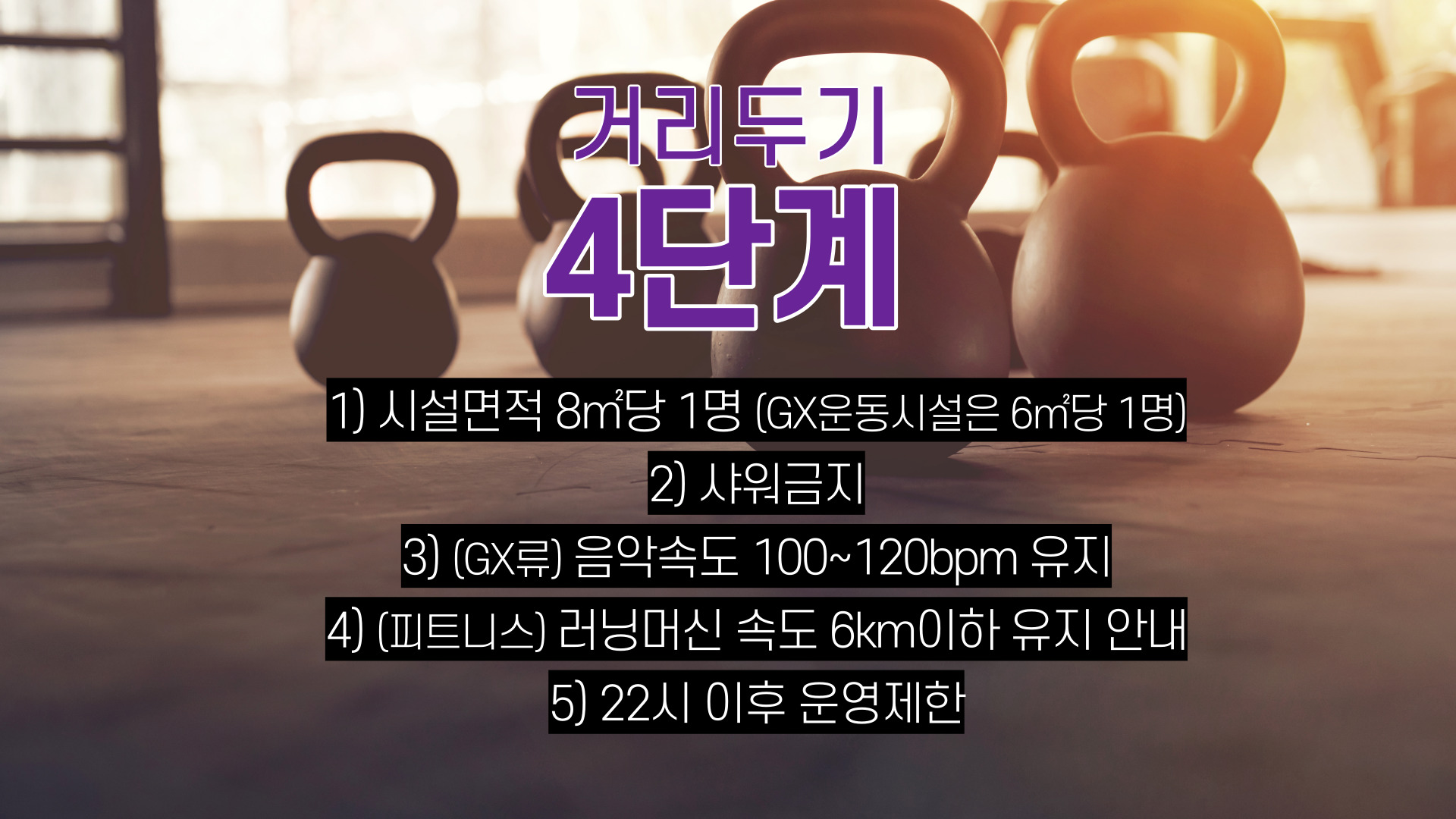 헬스장 거리두기 단계에 따른 적용 수칙 확인하세요.