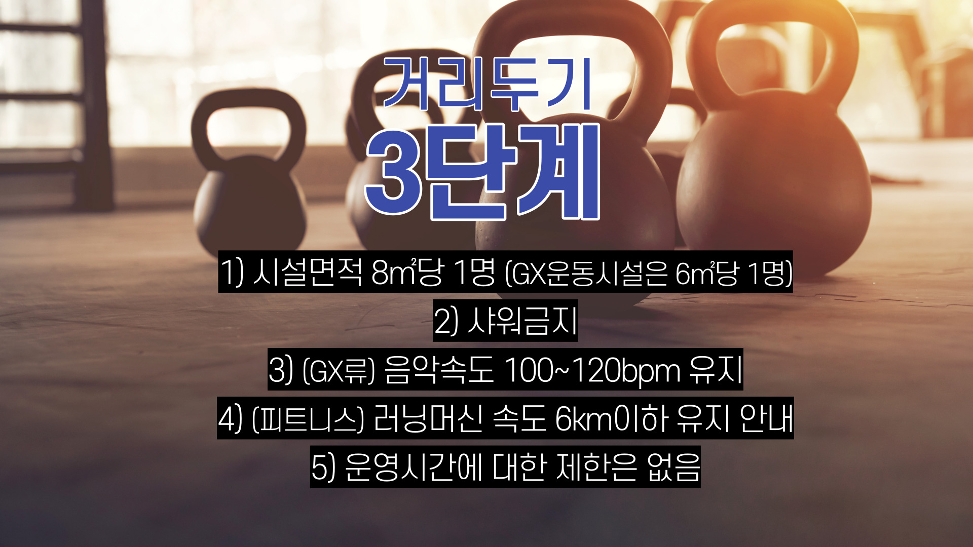 거리두기 3단계부터는 제한사항이 강화됩니다. 시설면적당 인원 제한은2단계와 동일합니다. 하지만 샤워가 금지되며 러닝머신 속도의 경우 6km6km 이하로 유지하여야 합니다. GX에서 사용하는 음악의 경우 100~120bpm의 속도를 유지하여야 합니다. 운영시간에 대한 제한은 없습니다.