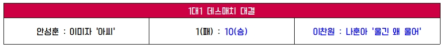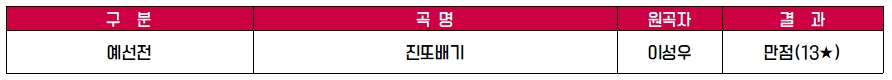 1대1 한곡 대결에서는 나태주 가수와 대결하였으며 남진의 ‘남자다잉’을 불렀습니다. 해당 대결의 경우 마스터 점수와 관객 점수를 합산하여 승패가 결정되는데 마스터 전원의 선택을 받아 마스터 점수 300점을 획득하였으며 관객 점수에서171점을 받아 합계 점수471점으로 117점을 받은 나태주 가수를 이기고 결승에 진출하게 됩니다.
