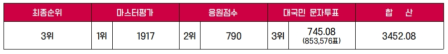 최종 순위는 결승전 두 개의 라운드의 마스터 평가 합산 점수와 대국민 응원투표, 대국민 문자투표 점수를 합산하여 최종 순위가 정해졌습니다. 마스터 평가 합산 1위, 대국민 응원투표 2위, 대국민 문자투표 3위를 달성하였고 최종 합산 점수로는 3위의 성적으로 미스터트롯의 대장정을 마무리하였습니다.