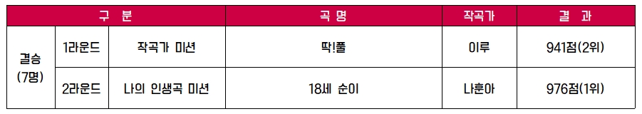 결승전은 작곡가 미션과 나의 인생곡 미션으로 이루어졌습니다. 1라운드 작곡가 미션에서는 작곡가 이루의 ‘딱!풀’을 불러 마스터 평가 2위를 차지하였습니다. 조영수 작곡가는 신곡의 경우에는 음악에 목소리가 묻히기 쉬운데 이찬원의 목소리는 반주를 이끄는 목소리였다라고 평했습니다.