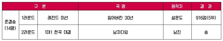 1대1 한곡 대결에서는 나태주 가수와 대결하였으며 남진의 ‘남자다잉’을 불렀습니다. 해당 대결의 경우 마스터 점수와 관객 점수를 합산하여 승패가 결정되는데 마스터 전원의 선택을 받아 마스터 점수 300점을 획득하였으며 관객 점수에서171점을 받아 합계 점수471점으로 117점을 받은 나태주 가수를 이기고 결승에 진출하게 됩니다.