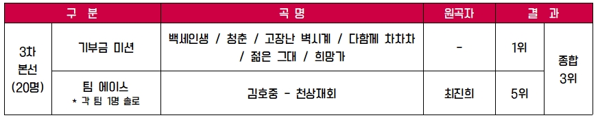 3차 본선은 기부금 미션과 팀 에이스(팀당 1명)로 진행되었습니다. 팀 에이스 미션의 경우 이찬원이 속해있던 패밀 리가 떴다 팀의 김호중 가수가 참여했으며 5위를 했습니다. 기부금 미션은 6곡의 노래를 불렀으며 1위를 차지했습니다. 기부금 미션의 경우 관객 점수가 매우 중요한 미션이었으며 5개의 팀 중 관객 점수 1위를 하였습니다. 2개의 미션의 점수를 합산하여 3차 본선에서 최종 3위를 하였습니다.