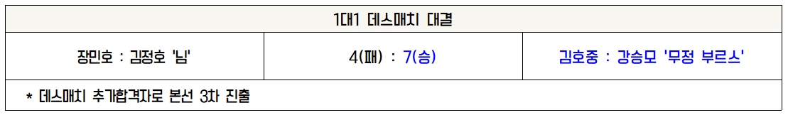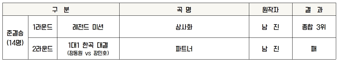 1대1 한곡 대결은 30살이 차이나는 정동원 가수와 함께했습니다. 남진의 ‘파트너’를 불렀으며 장민호 가수의 배려심이 돋보이는 무대였습니다. 남진은 두 가수가 최고의 파트너이었으며 오랜만에 정말 쇼다운 쇼, 하나의 작품을 본 것 같다고 평가하였습니다. 작곡가 조영수는 파트 분배를 보았을 때 장민호 가수가 동생이고 후배인 정동원 가수에게 많은 양보를 해준 것으로 보았습니다. 역시 선배이며 좋은 가수라고 칭찬하였으며 실력적인 측면으로 보았을 때는 50대 50으로 정말 어려운 선택이라 하였습니다. 심사위원 점수는 90대 210으로 장민호 가수가 밀렸으며 관객 점수에서는147대 145로 조금 앞섰습니다. 합계 점수는 237대 355로 결국 패했지만 종합 7위로서 결승 진출을 확정 지었습니다.