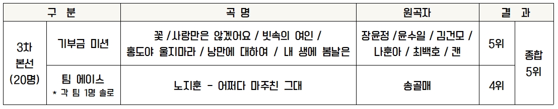 기부금 미션에서는 ‘꽃’, ‘사랑만은 않겠어요’, ‘빗속의 여인’, ‘홍도야 울지마라’, ‘낭만에 대하여’, ‘내 생에 봄날은’의 6곡을 불렀으며 아쉽게도 심사위원점수와 관객점수 두 부분 모두 저조한 성적으로 5위를 하였습니다. 팀 에이스 미션은 노지훈 가수가 참가하였으며 송골매의 ‘어쩌다 마주친 그대’를 불러 4위의 성적을 거뒀습니다. 두 미션의 종합점수에서 결국 5위를 하였으며 아쉽게도 4명의 팀원 중 김경민 가수와 장민호 가수만이 준결승에 진출하였습니다.