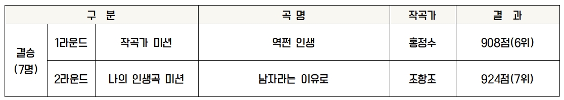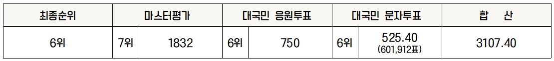 최종 순위는 6위로 세부 항목으로는 마스터평가 7위 대국민 응원투표 6위, 대국민 문자투표 6위를 하였습니다. 장민호 가수는 참가 전부터 어머니들의 대통령이라는 애칭이 있을 정도로 인기가 많았던 참가자였습니다. 경연이 진행되면 진행될수록 왜 많은 분들이 그렇게 장민호라는 가수에 열광하는지를 알게 하는 실력이었습니다. 또한, 방송에 잡힌 그의 모습은 사람으로서도 참 ‘멋지다’라는 말이 어울리는 모습이었습니다. 훌륭한 실력에 훌륭한 인성까지 갖춘 가수로서 승승장구해나갈 앞으로의 미래가 더 기대됩니다.