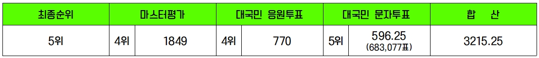 최종 성적은 3215.25점으로 5위의 순위로 미스터트롯의 마지막을 마무리하였습니다. 세부항목에서는 마스터 종합평가 4위, 대국민 응원투표 4위, 대국민 문자투표 5위를 하였습니다. 처음 정동원 군을 방송에서 보았을 때는 과연 저 어린 친구가 어디까지 갈 수 있을까?라는 생각을 많이 하였습니다. 하지만 방송이 진행되면 될수록 어린 친구가 아니라 한 사람의 가수로서 그 자리에 있는 거구 나라는 느낌을 많이 받았습니다. 개인적으로는 정동원 가수가 부른 ‘여백’의 무대에 대한 여운이 오래 남았습니다. 앞으로도 창창하게 빗나는 가수로서의 길을 걸어 나갈 정동원 가수를 응원합니다.
