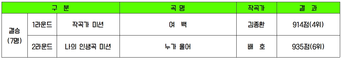 작곡가 미션에서 김종환 작곡가의 ‘여백’을 불렀습니다. 김종환 작곡가는 노사연의 ‘바램’을 작곡가로 유명한 작곡가입니다. 이번 노래인 ‘여백’은 인생을 살아본 후에 인생을 한 편의 그림으로 비유한 시적인 가사가 특징적입니다. 노래를 처음 보며 드는 생각은 아직 살아온 날이 적은 정동원 가수에게는 맞지 않는 옷일까 걱정이 들었습니다. 하지만 걱정은 기우였습니다. 그 누구보다도 담백하게 본인만이 전할 수 있는 감동을 전하는 무대였습니다. 김준수는 인생을 다 살아본 것 같다며 감탄하였습니다. 장윤정은 섬세한 디테일과 욕심을 부리지 않고 노래의 감성을 순수하게 표현하는 모습을 보며 가르침을 받는 느낌이라고 극찬하였습니다. 작곡가 미션은 914점으로 4위를 하며 마무리하였습니다.