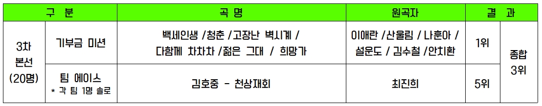 3차 본선은 팀 2개의 미션이 팀 미션으로 이루어지며 기부금 미션은 6개의 곡으로 구성하였습니다. ‘백세인생’, ‘청춘’, ‘고장난 벽시계’, ‘다함께 차차차’, ‘젊은 그대’, ‘희망가’의 6곡으로 구성한 하였으며 심사위원 총점 976점으로 1위를 차지합니다. 곡명을 잘 살펴보시면 주제를 청춘으로 잡았다는 것을 알 수 있습니다. 사실 이러한 주제를 잡게 된 단초는 정동원 가수가 낸 아이디어입니다. 개인적으로는 6곡의 노래들 중 ‘희망가’ 무대가 가장 인상적이었습니다. 정동원 가수가 단독으로 꾸민 해당 무대를 보며 어찌 그 작은 몸에서 그러한 감성을 끌어낼 수 있는지에 대한 의문이 들었고 역시 천재는 다르다는 느낌을 받았습니다. 이 부분에 대해서는 이견의 여지가 없다고 생각합니다. 많은 관객들과 심사위원들도 눈시울을 붉히게 한 무대였습니다.