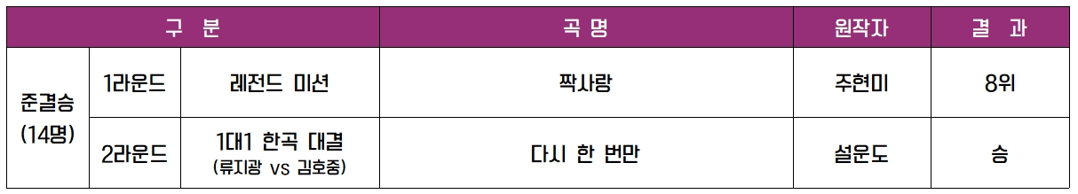 1대1 한곡 대결은 류지광 가수와 대결하였으며 설운도의 ‘다시 한 번만’을 불렀습니다. 원곡자인 설운도는 최고의 가창력을 보여준 무대라고 극찬하였습니다. 조영수 작곡가는 어쩌면 마지막일지도 모르는 무대에 다 쏟아내는 모습이 멋있고 감동이었다고 말하며 특히 이번 무대에서 트로트적인 발성이 돋보였다고 평했습니다. 이러한 부분은 새롭게 트로트적인 부분으로의 노력이 보이는 부분이라며 극찬하였습니다. 결과는 심사위원 점수 240대 60점, 관객점수 188대 105점, 합계 점수 428점대 164점으로 김호중 가수가 승리하였습니다. 종합적인 점수에서 5등을 차지하며 7명만이 진출할 수 있는 결승에 진출을 확정하였습니다.
