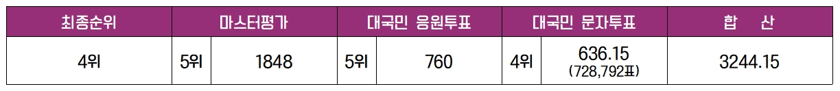 최종순위는 4위를 하였으며 세부 항목으로는 심사위원 평가 6위, 대국민 응원투표 5위, 대국민 문자투표 4위를 하였습니다. 김호중 가수는 미스트롯을 보았을 때 남자 편을 하면 꼭 참여해야겠다는 생각을 했다고 합니다. 전체 지원자 중에서도 상당히 앞의 지원자일 정도로 그 생각은 확고했으며 결과적으로 성공적이었습니다. 성악을 하는 입장에서 가요에 도전하는 것이 쉬운 것은 아니었을 겁입니다. 기본적으로 발성적인 측면에서 많이 다르기 때문인데 그러한 도전정신이 있었기 때문에 지금의 트바로티 김호중 가수가 있는 것입니다. 무대를 가득 채우는 풍부한 성량을 기본으로 한 김호중 가수만의 안정적이고 단단한 발성과 가사에 진정성을 담아 노래하는 전달력은 그 누구도 흉내 낼 수 없습니다. 앞으로가 더 기대되는 김호중 가수를 응원합니다.
