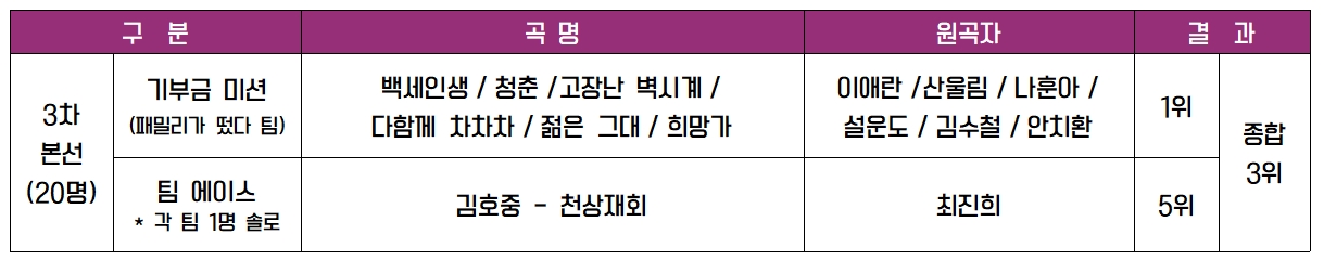 3차 본선은 팀으로 진행되었으며 기부금 미션에서는 청춘이라는 주제로 ‘백세인생’, ‘청춘’, ‘고장난 벽시계’, ‘다함께 차차차’, ‘젊은 그대’, ‘희망가’의 6곡으로 구성하였습니다. 5명의 심사위원에게 100점 만점을 받았으며 976점으로 ‘사랑과 정열’팀과 함께 심사위원 점수 공동 1위를 하였습니다. 관객 점수인 기부금 점수에서는 217.8점으로 1등을 하여 기부금 미션에서 종합 1위를 차지하였습니다.